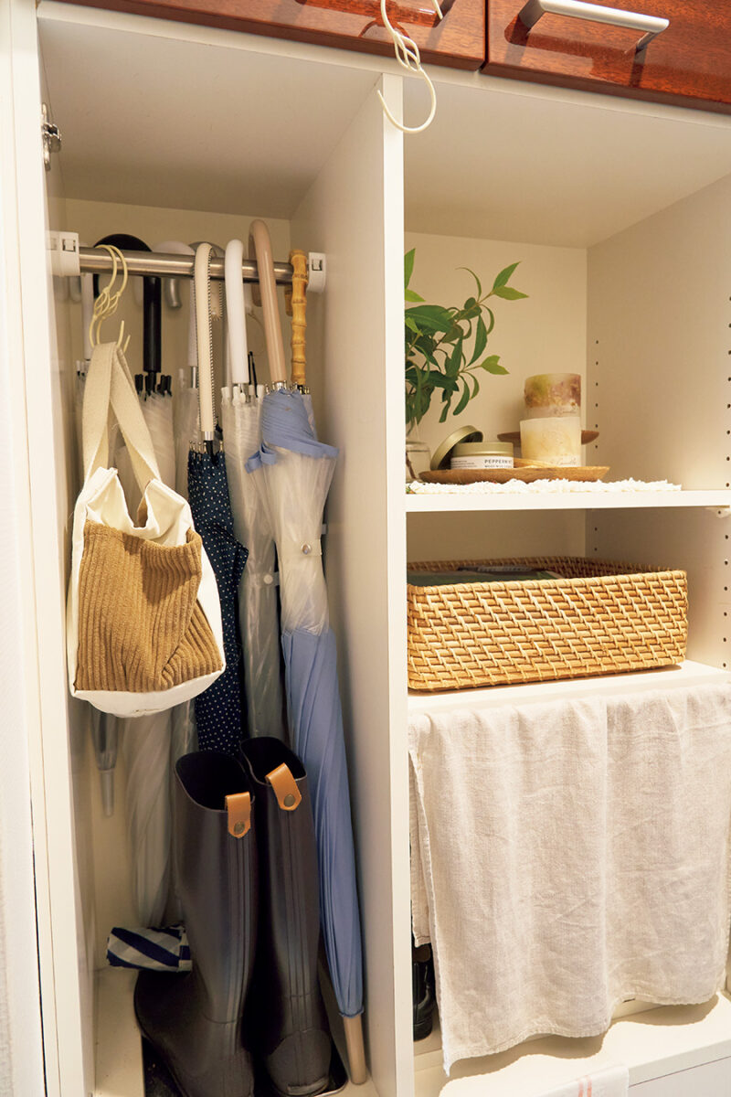 「玄関の片側は壁一面が扉付きのシューズラックでした。1 mほどの狭い空間で、扉があるぶんスペースも少なくなるので、思い切ってすべて外しました。出し入れもラクです」