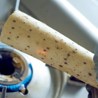 1. 長いもは火で炙ってひげ根をとり、乱切りにする。