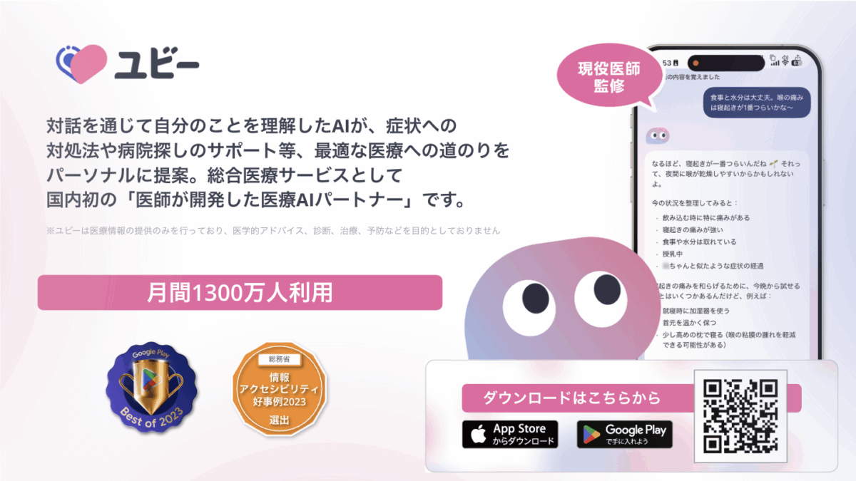 さまざまな情報があふれる今「ネット検索するだけでは不安」「何が正しい情報なのかわからない」と体調不良を抱えながらも受診すること自体を迷っている方はぜひ、診療科の隔たりなく、適切な医療への橋渡しをサポートしてくれる対話型サービス「ユビー」などでの受診相談を試して、納得のいく医療への第一歩を踏み出してください。