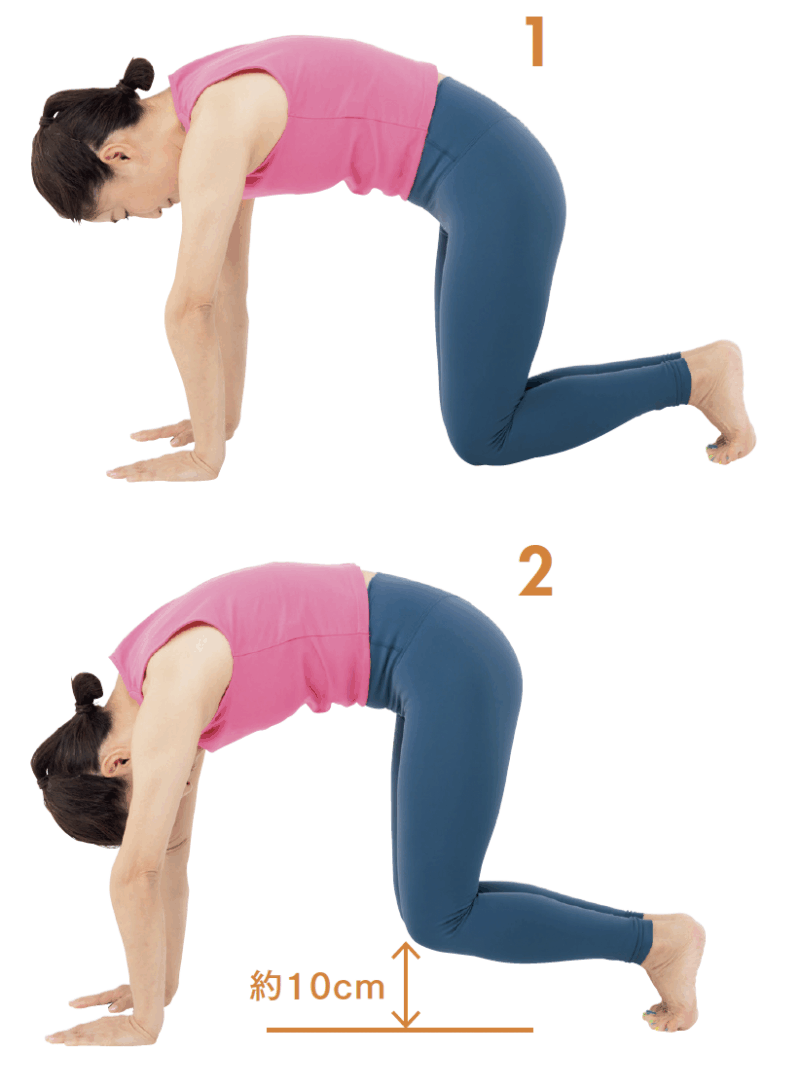 2. 1の状態から、膝を10cm程度持ち上げ、骨盤底筋をぎゅっと引き締めます。10回が目安。