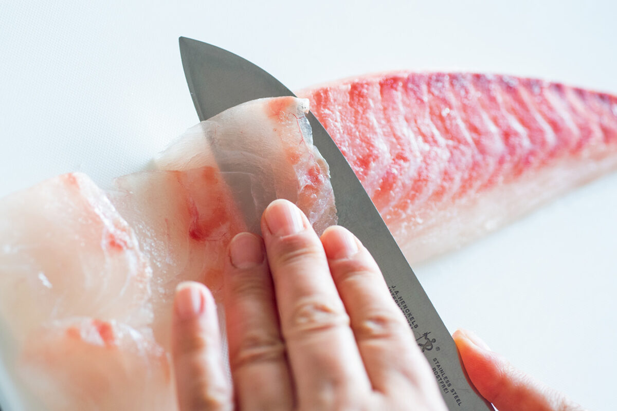柵の状態で2 時間くらい凍らせ、ルイベ状態で包丁を入れると、きれいな薄切りにできます。