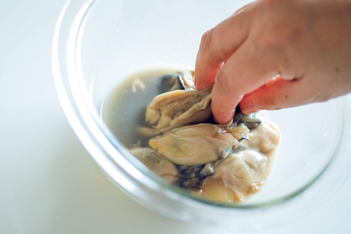牡蠣は粗塩でやさしくもみ洗いを。