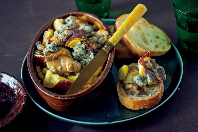 4. 耐熱皿に2と3を盛り、ブルーチーズをちぎってのせ、温めたトースターで3 ~4 分、焼き色がつくまで焼く。お好みでバゲットと一緒にいただく。