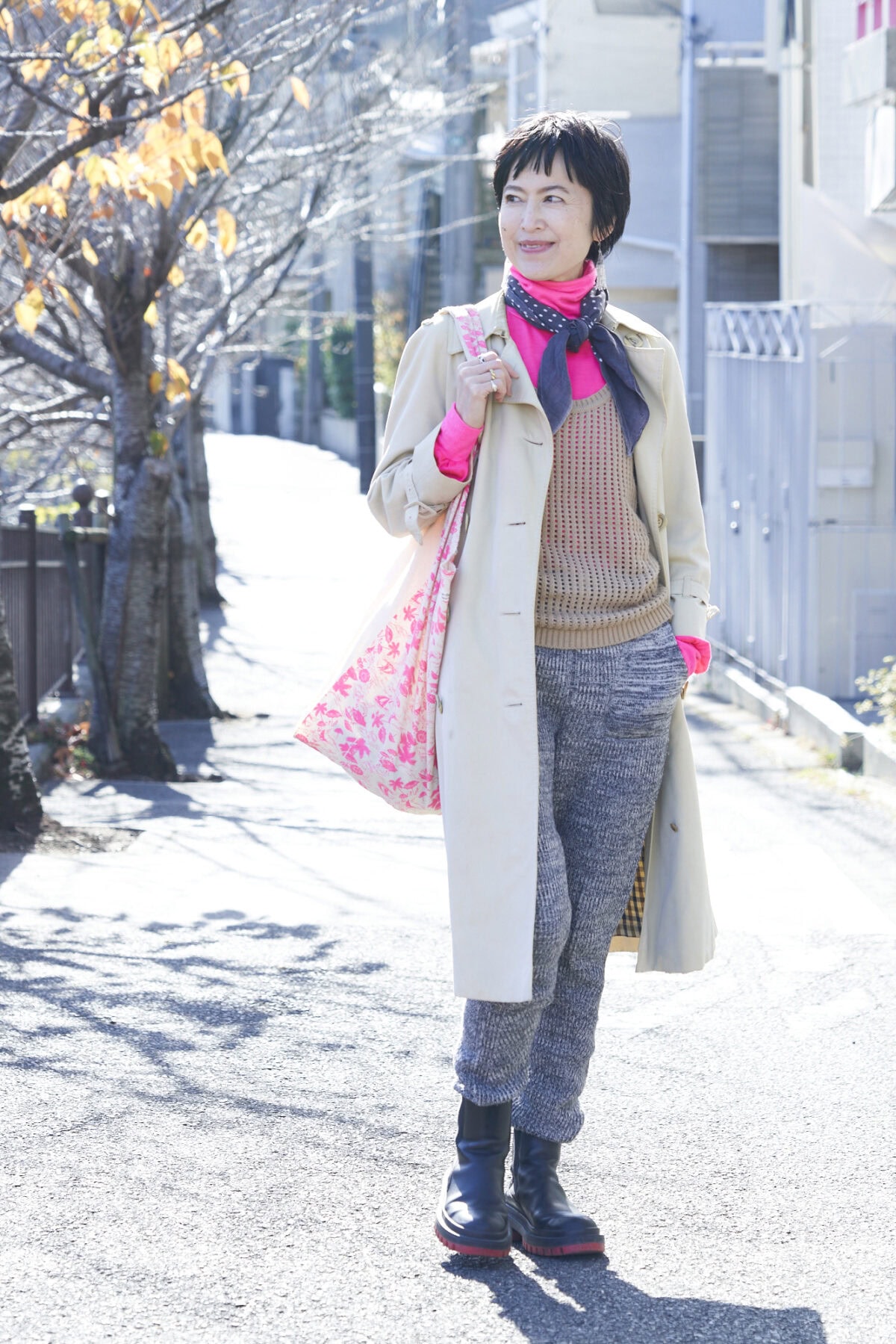 おしゃれ賢者のリアルな着こなしとワードローブを拝見する「1週間コーデ」。今週はアーティストの藍田美豊(あいだ みほ)さん(56歳/身長163cm)。ヴィンテージのトレンチコートとメンズサイズのカーディガンをアウターに、ネオンピンクと赤を効かせたきれいめパンツスタイルをご紹介します!