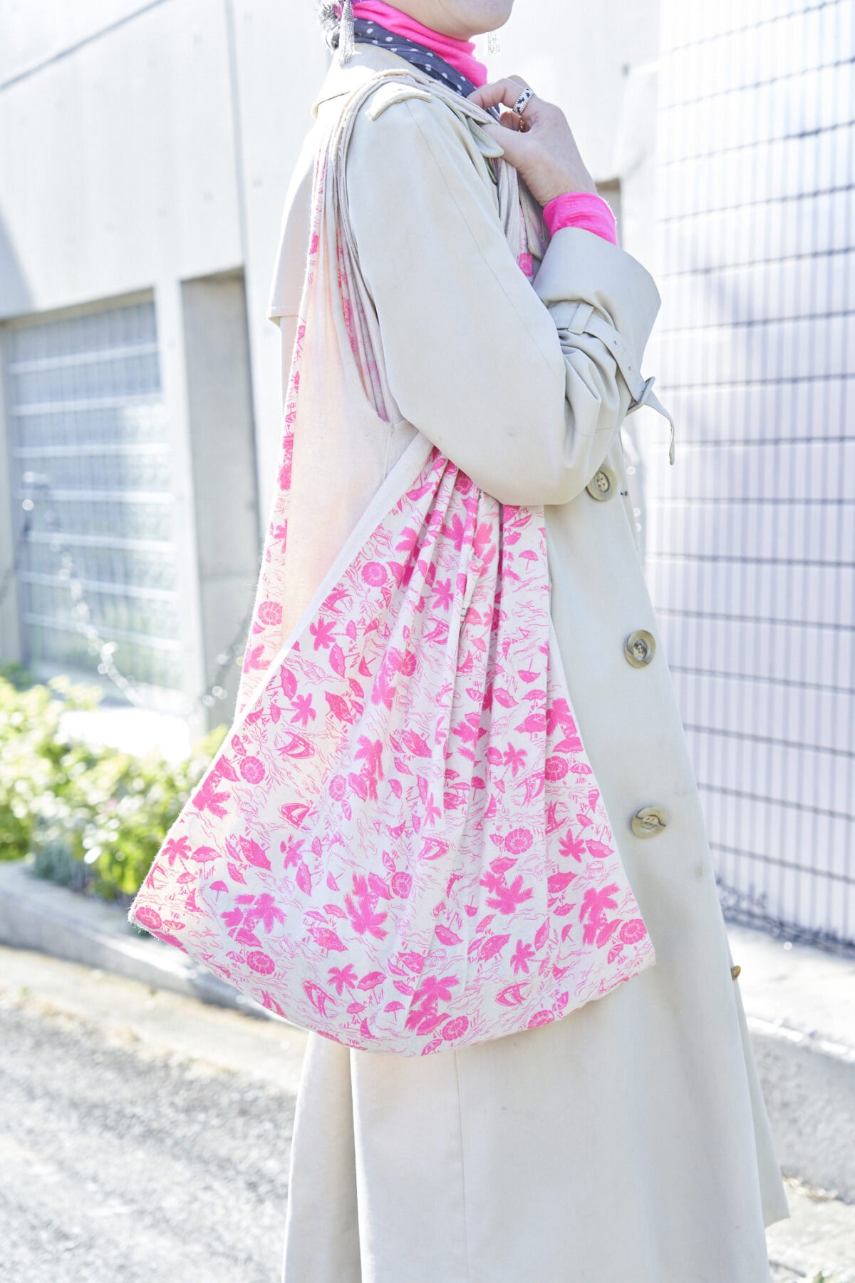ネオンピンクのタートルネックのカットソーは、90年代のヴィンテージ。「色が合うと思って、このピンクのマルシェバッグを合わせました」と藍田さん。ピンクコーデをおしゃれに見せるには、色合わせとバランスがポイント。