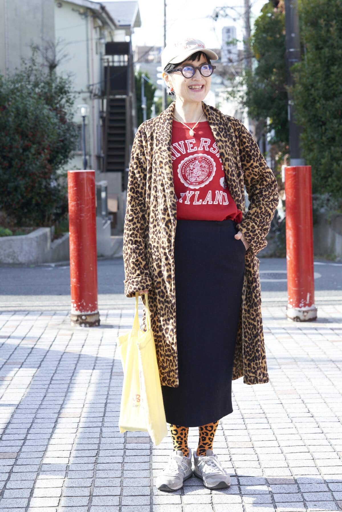 「外反母趾なのでスニーカーが中心。なかでもメイドインUSAのニューバランス996は、はきやすくてデザインも好み。これで三代目になりますね」と藍田さん。アウターに合わせたレオパ柄のソックスは、地元のテキーラバーで見つけました。
