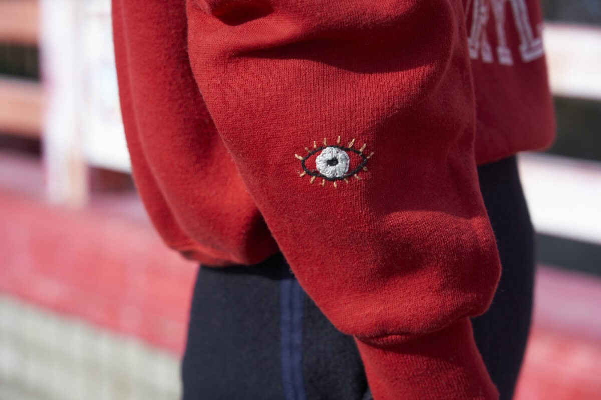 「手を動かすのが好きで、ヒマを見つけては古着に刺しゅうをしています」と藍田さん。手と目のモチーフは、藍田さんのお気に入り。