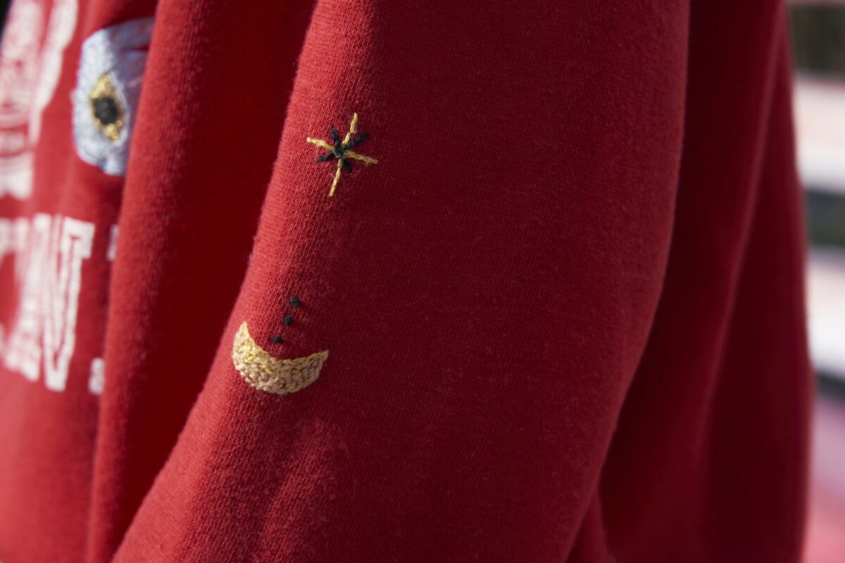 左袖には、三日月と星をモチーフに刺しゅうをしました。古着に刺しゅうをすると愛着もひとしおに。