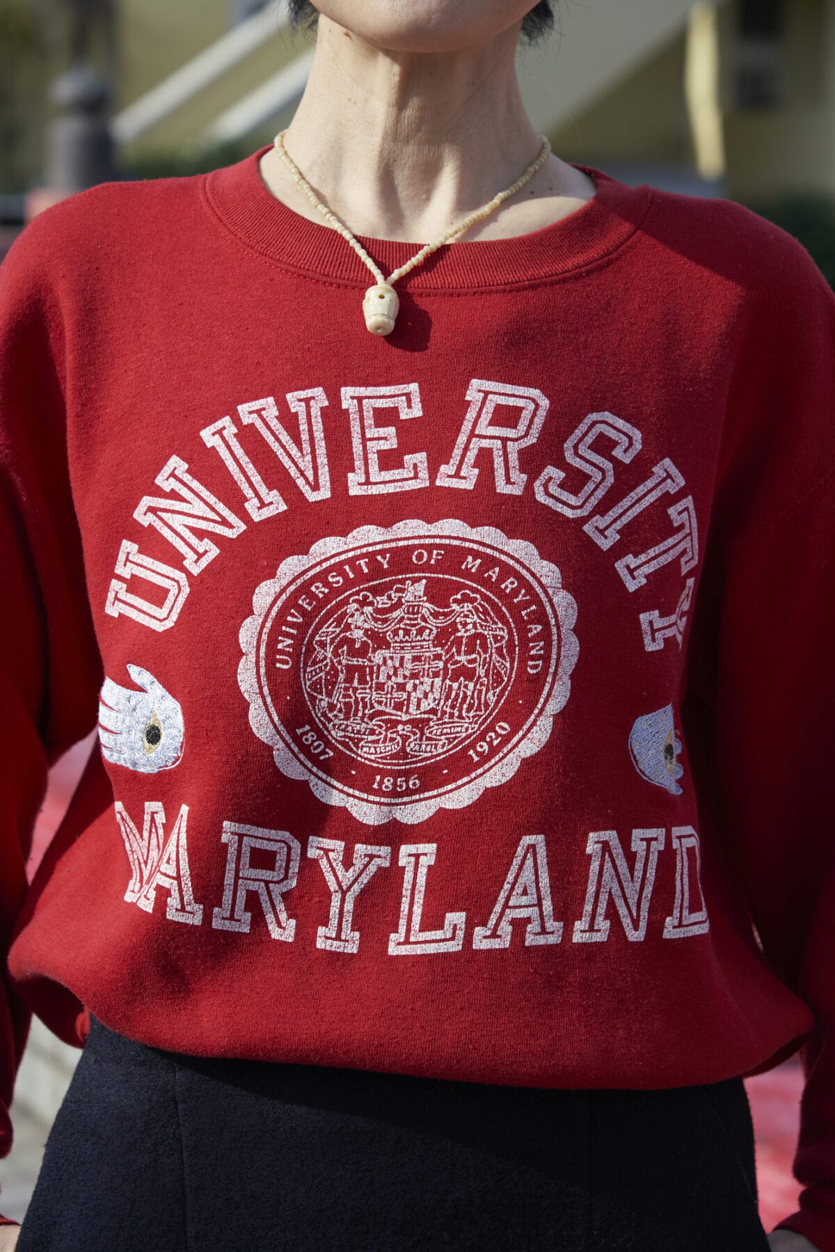 メリーランド州立大学のトレーナーは、古着ショップで見つけたメイドインUSA。赤字に白のロゴが、着こなしのアクセントに。