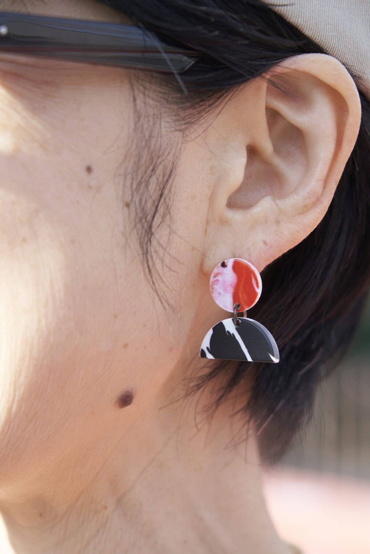 円と半円のセルロイドのプレートを合わせたピアスは、遊び心満載。華やかな洋服に似合います。