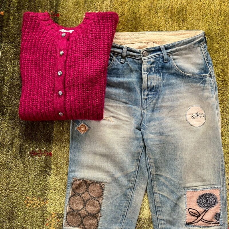 古着のニットには、ミナペルホネンのはぎれで作ったボタンを。デニムにははぎれを縫い付けてリメイク