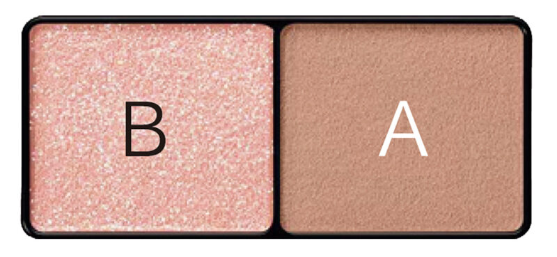 マットなベージュ×ラメピンク。質感の違いが目元にこなれ感と奥行きを与える。