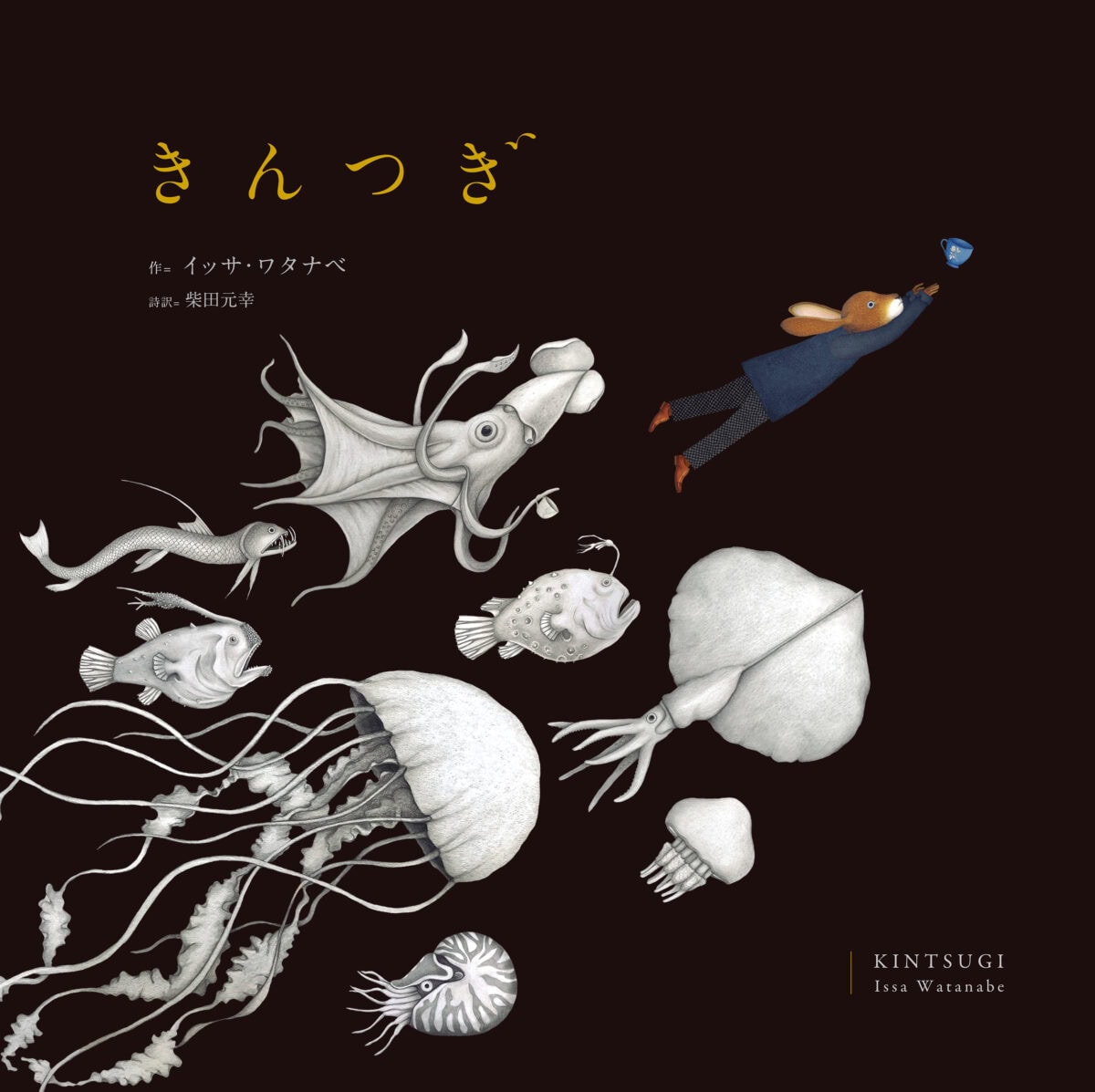 うさぎが青いコップと白いコップを持ってきました、小鳥とお茶会をしようと。ところが青いコップは割れ、小鳥は飛び立とうとした途端にテーブルクロスを引っ掛けてしまいます。テーブルの上のオブジェたちはばらばらに。うさぎは悲しみの淵をさまよいます。そして希望の光が……。「金継ぎ」という日本の伝統的技法に着想を得て、人の絶望と喪失感、そして希望と再生を寓話的に描いたもの。文字はなく、静かに美しい絵を追うサイレント絵本です。金継ぎとは、器の破損をわざと目立たせ、味わいとして際立たせる修復技術。青いコップと白いコップの行方も見どころです。