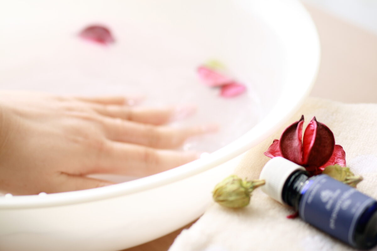 朝の洗顔前(または洗顔後)に、洗面器に40〜42度のお湯を張り両手を手首までつけて3分ほど温めましょう。お湯にアロマを1滴加えるのもおすすめ。オレンジやグレープフルーツなどの柑橘系のアロマは、肝の働きを高めてめぐりをよくします。毎日の習慣にすることでメノポハンドの進行予防につながります。