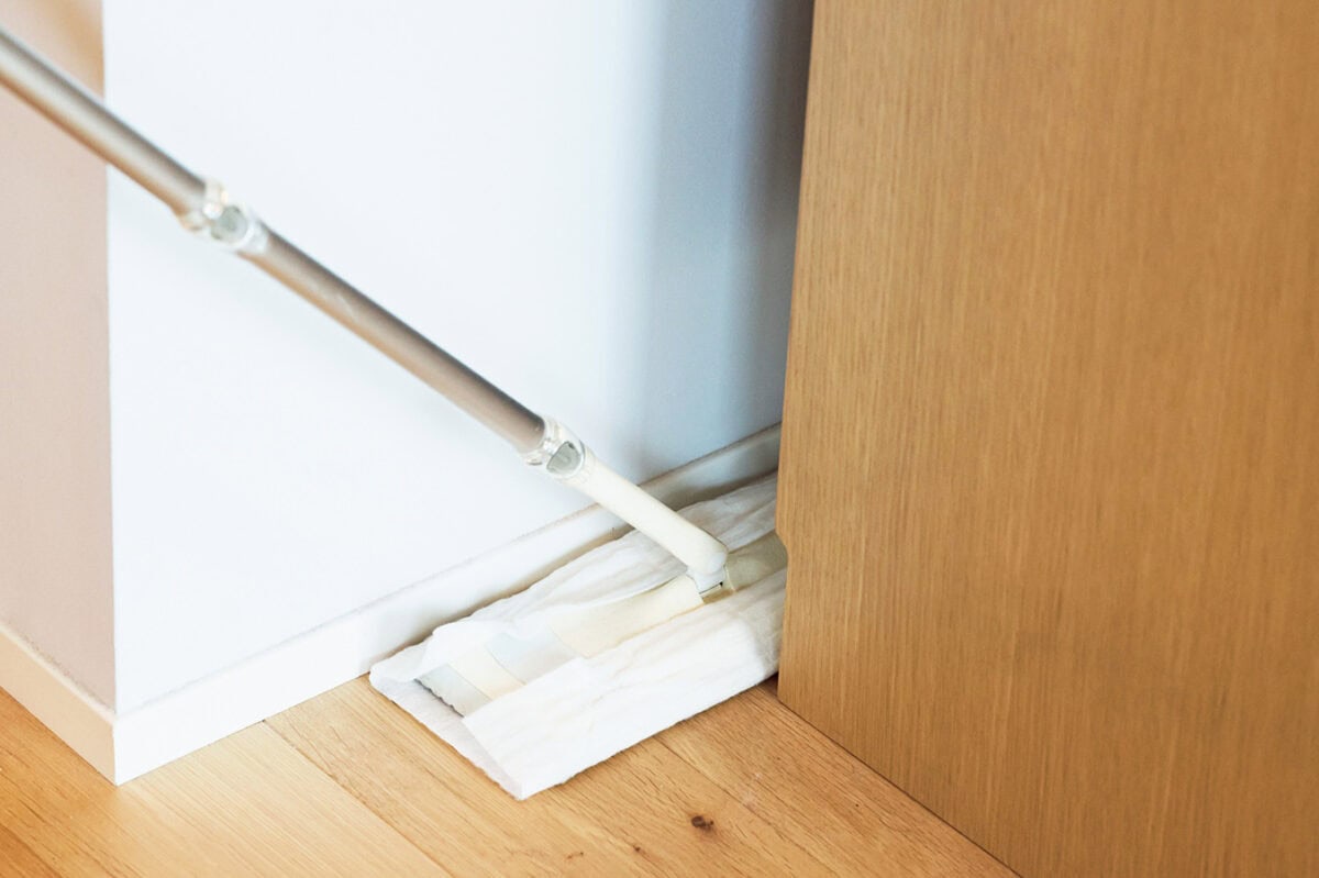 フローリングワイパーの柄を短くして床拭き用のウエットシートをセットし、上から下へと拭きます。
