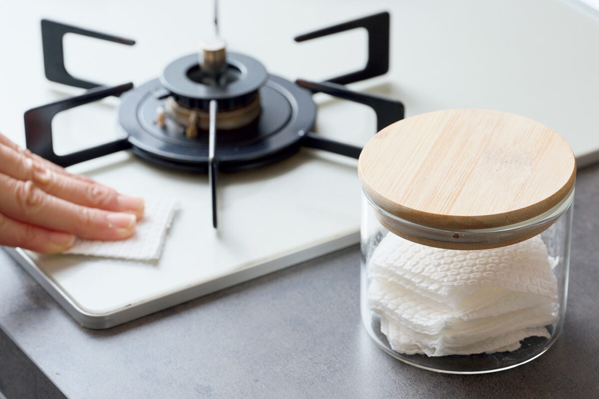 キッチンペーパーを9分の1の大きさに切った“ミニキッチンペーパー”を作り、煮汁や油が飛んだら、その都度コンロを拭いて。