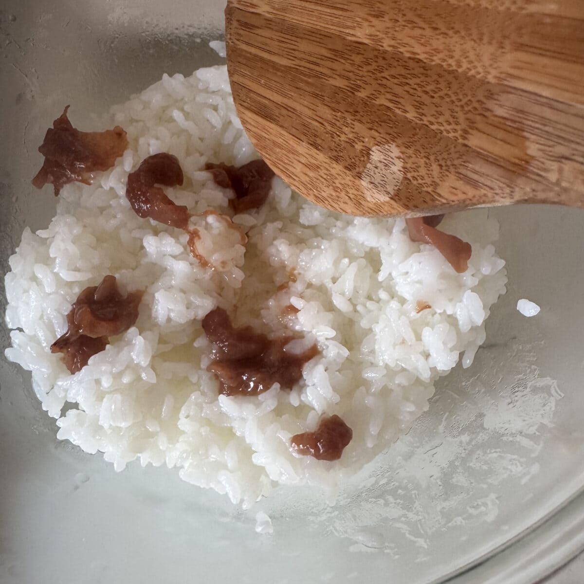 梅干しはつぶさないで、さっくりとごはんに混ぜるのがコツ。