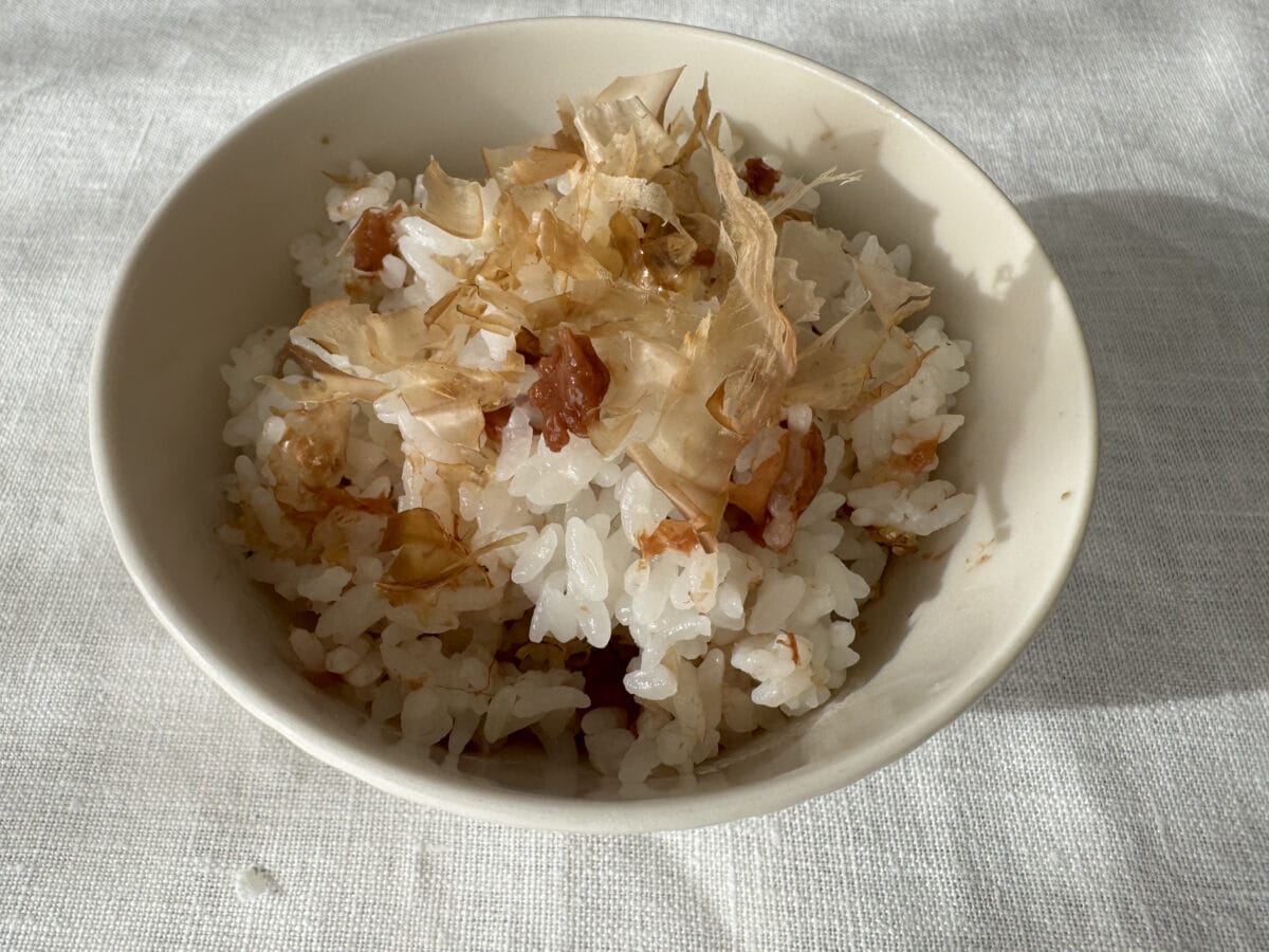 かつお節は、たんぱく質が豊富。「勝男武士(かつおぶし)」「勝つ」に通じる名前を持ち、昔から縁起の良い食材といわれています。梅ごはんを、鍋の締めに入れてもおいしい。