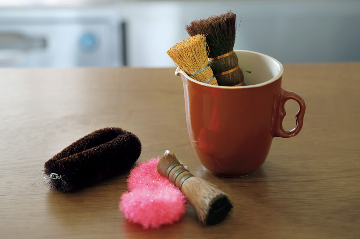 「細かい所にも入り込み汚れを掻き出してくれます」。イレブンセカンドの手編みのアクリルたわしは洗剤不要で汚れが落とせる優れもの。店頭でも¥1,100で販売中。