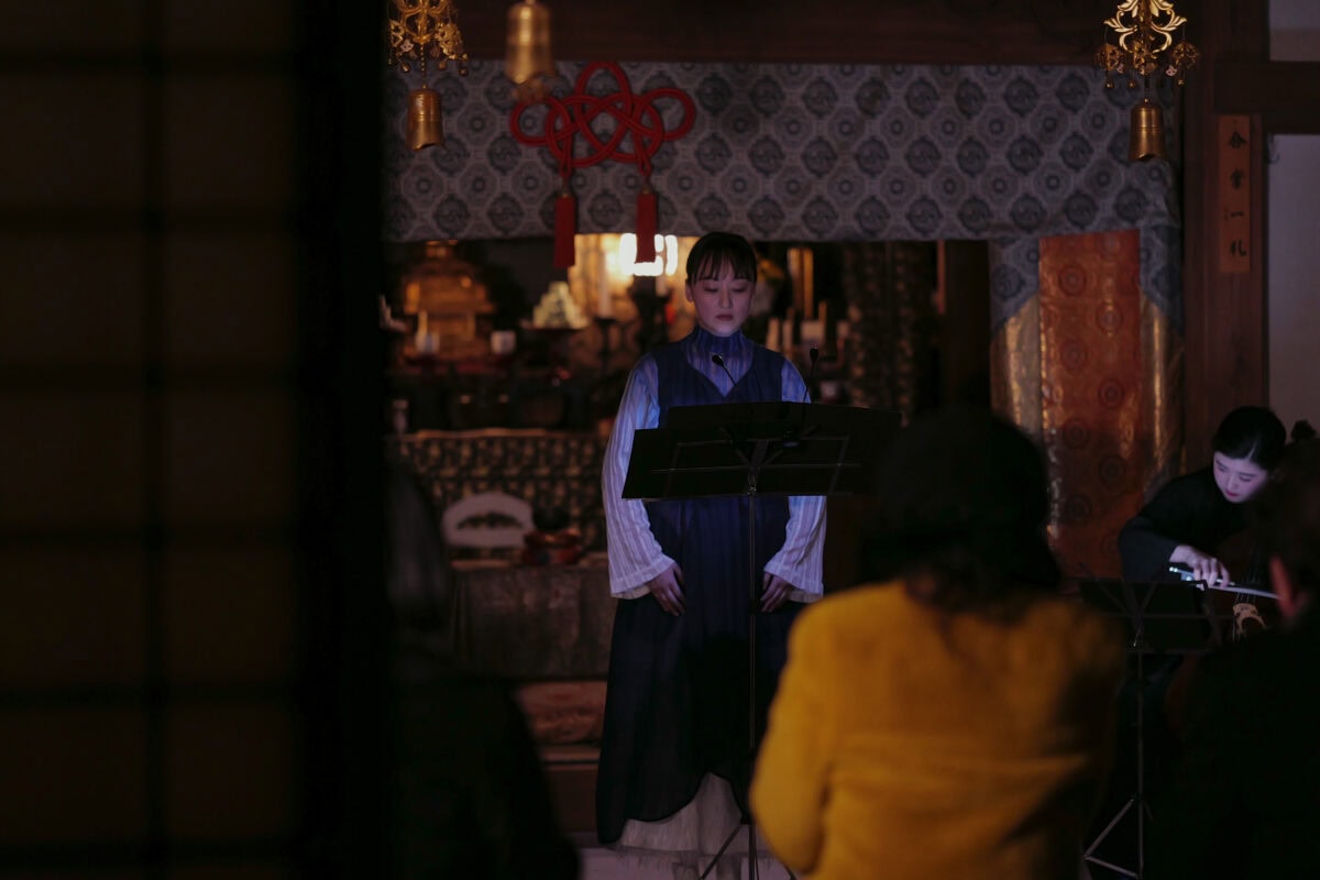 本堂に移動して畳の上に座ると、空気がふるえるようなチェロの音色とお能の謡が始まりました。その迫力たるや、心にずしんと響いたかと思えば、異界を彷徨うような不思議な浮遊感に包まれました。遡ること691年前にこの地に開かれた名刹報国寺。その本堂ゆえに、目には見えないものたちと共鳴するようにも感じます。14名のゲストだけのために奏でられる音楽、能声楽の贅沢さといったら、生涯忘れられぬ体験になることでしょう。
