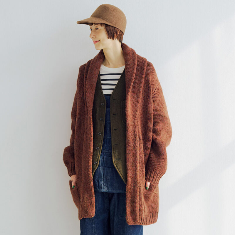 デニムジャケット¥30,800、サスペンダー付きスカート¥28,600/ともにポルテ デ ブトン、フードベスト¥46,200、ブーツ¥71,500/ともにプレインピープル(プレインピープル青山)、タートルネックニット¥2,990/ユニクロ、カゴ¥14,300/ハリス(金万)、カゴに入れたストール¥10,780/ツイードミル(セムインターナショナル)