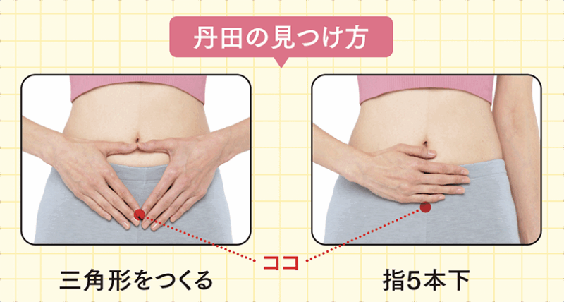 へその下に手を当てて、指5本分、小指の少し下奥辺りにかかるエリアが丹田。