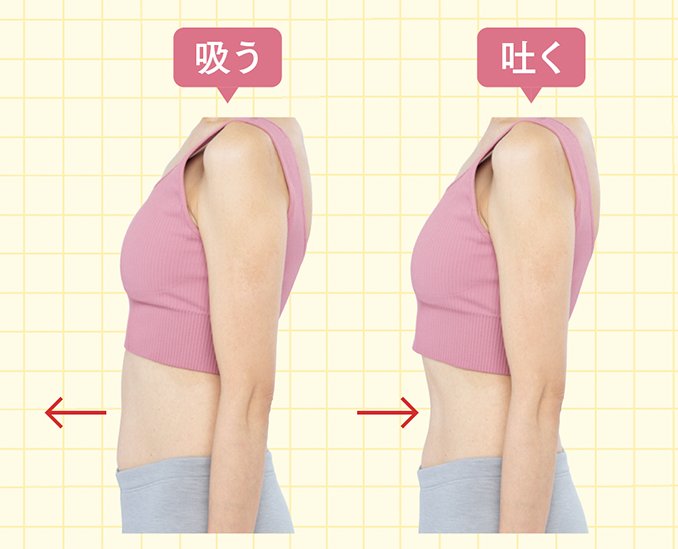 まずは腹筋の力で空気を押し出し、下腹をへこませながら毒素を吐き出すように鼻から息を吐く。おなかを膨らませながら鼻から息を吸う。