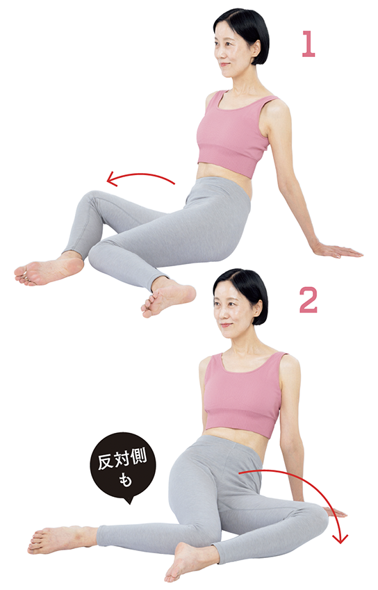 膝を立て足を大きめに開いて座り、手は床に。息を吐きながらゆっくり膝を倒す。