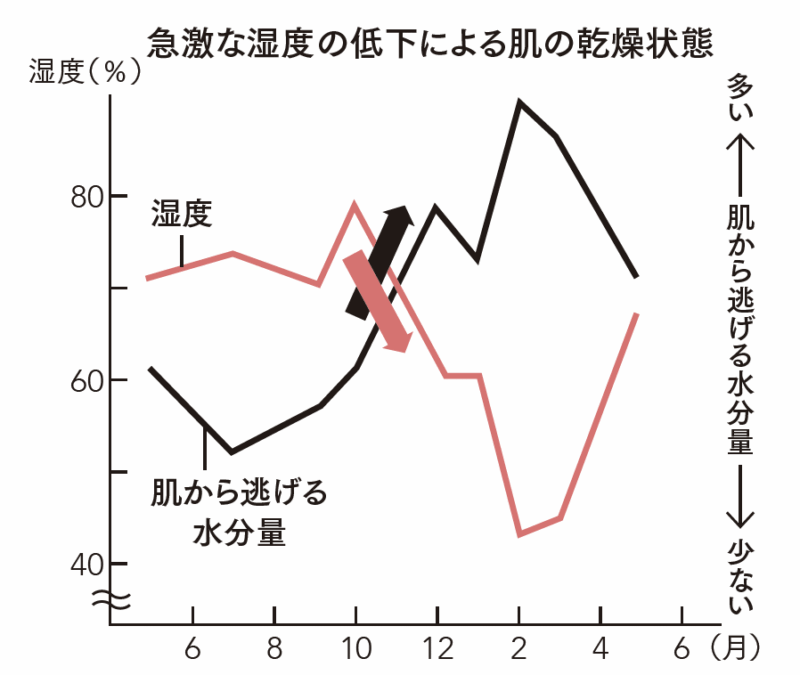 下の2つのグラフは、毎月の湿度と肌から逃げる水分量、角層内水分量の季節ごとの変化を表したもの。空気が乾燥する季節は、肌も乾燥しやすいことがわかります。
