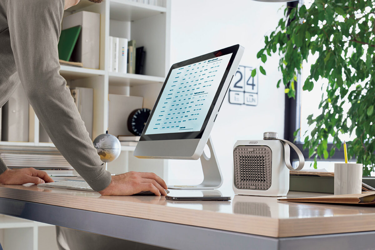 コンパクトなヒーターから温風が出て手もとや足もとを温めます。風向きはパネルの向きで変更可能。静音性も高いので、作業中やテレビを見ているときも音が気になりません。