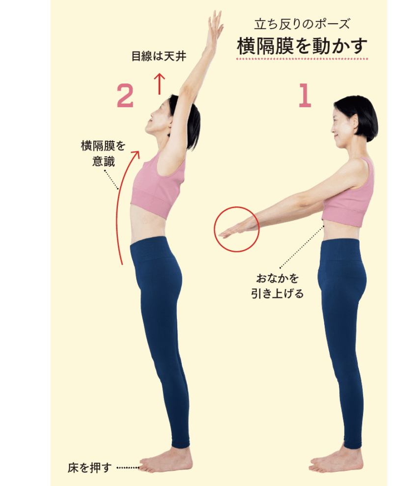 上体を反らせながら、ゆっくり丁寧な呼吸を行って、代謝を上げていきます。横隔膜を大きく動かすことで、下垂気味の内臓が正しい位置に戻り、機能がアップ。