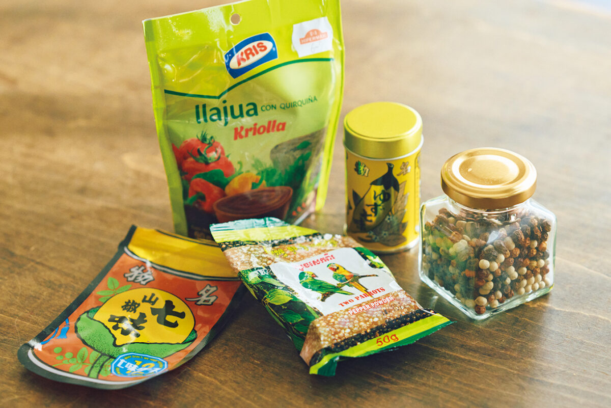 ボリビアで購入したサルサスパイスやペッパー、八幡屋磯五郎の山椒七味がお気に入り。