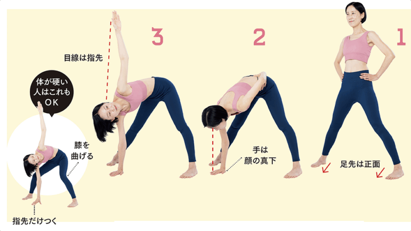 1. 両足を大きく開いて立ち、両手は腸骨に。息を吸いながら、背筋を伸ばす。