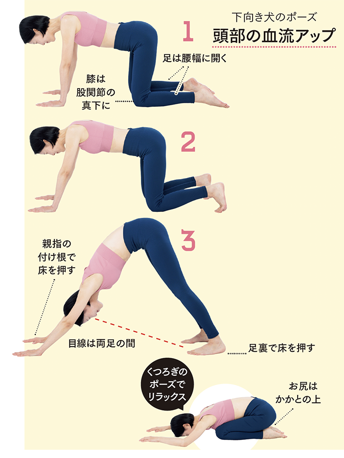 しわと白髪のエイジングサインは大人世代にとって大きな悩みのひとつ。頭を下にしてお尻を高く持ち上げることで、頭部の血流をアップさせましょう。