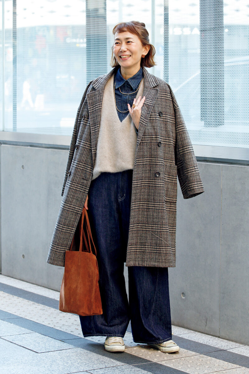 チェック柄のコートやブラウンのバッグ、トレンドアイテムを取り入れて今っぽさ全開。「アウターは『しまむら』で見つけた掘り出しものです」。