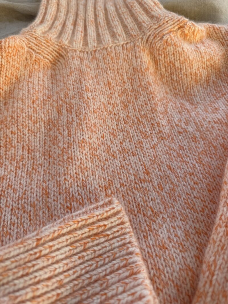 ウール100%なのにカシミヤのような柔らかさで、触れているとうっとりとしてしまいます。オレンジシャーベット色に一目惚れしました。友と楽しく過ごす一日に選ぶことの多いセーターです。