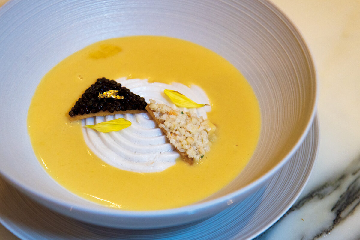 タラバガニ、キャビア、ココナッツカスタード、コーンポタージュを左右対称に盛り付けた「シンメトリー」。