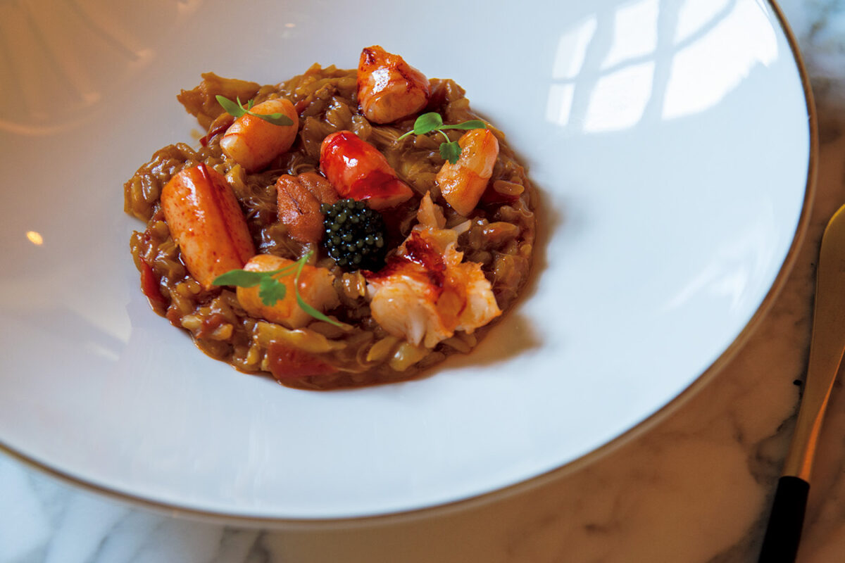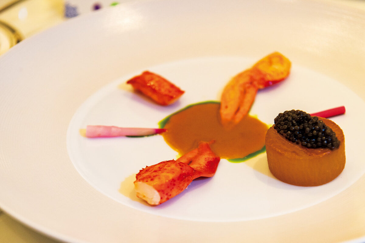 ロブスターにキャビアをのせた大根のコンフィを添えた「ミラード」。