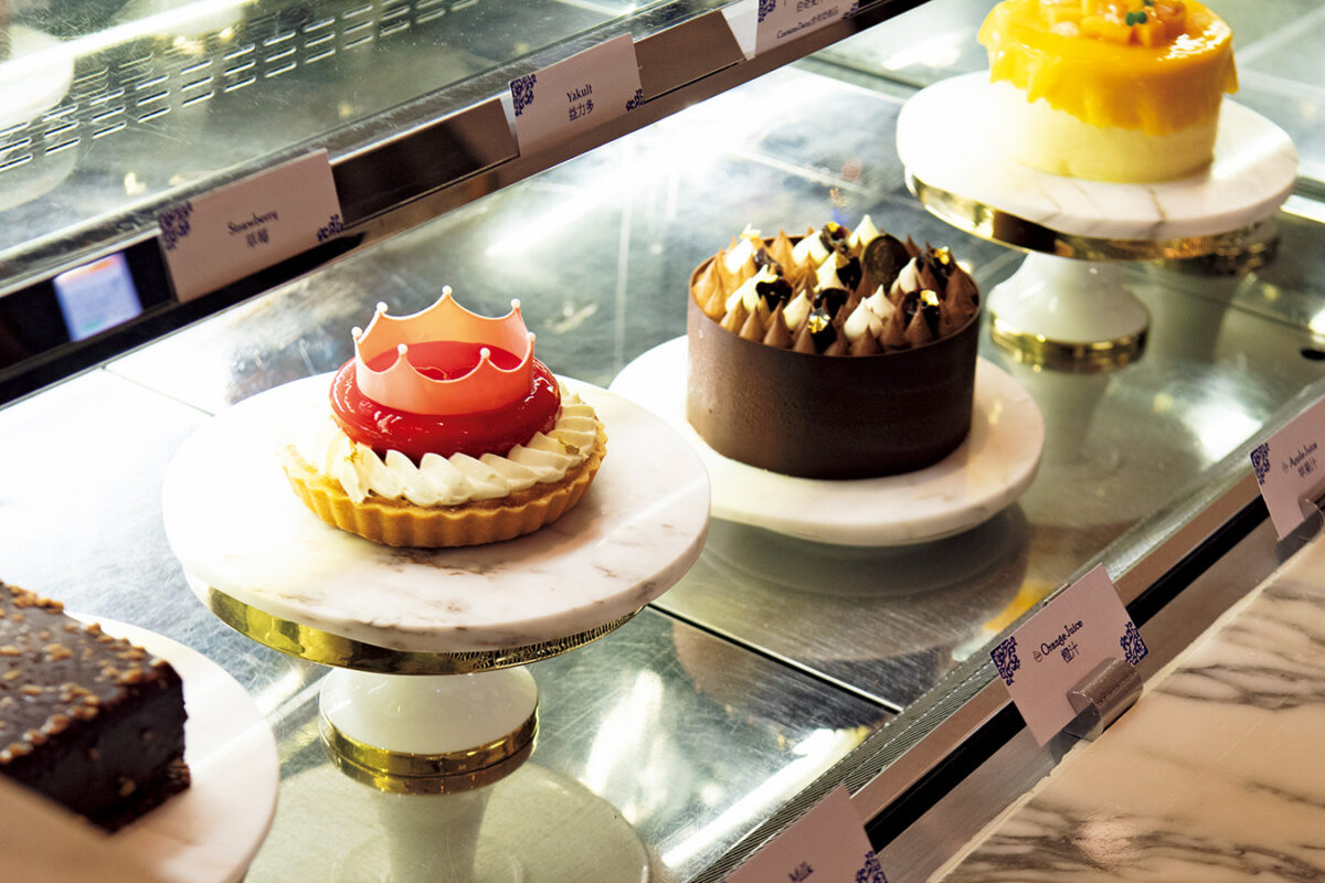 香港式ブレンドティー「冷鴛鴦珈琲」46 MOPと「シャインマスカットのエクレア」28 MOP。