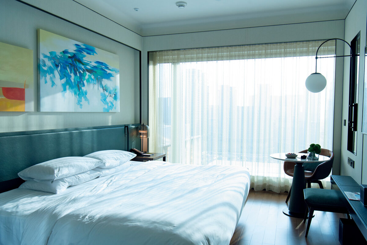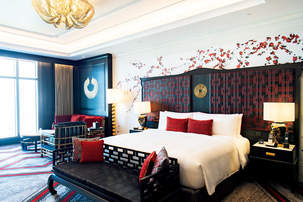 中国の伝統美に西洋のアールデコを融合させたシノワズリ調の客室や、約4,000冊のビジュアルブックが並ぶラウンジが非日常へと誘ってくれます。