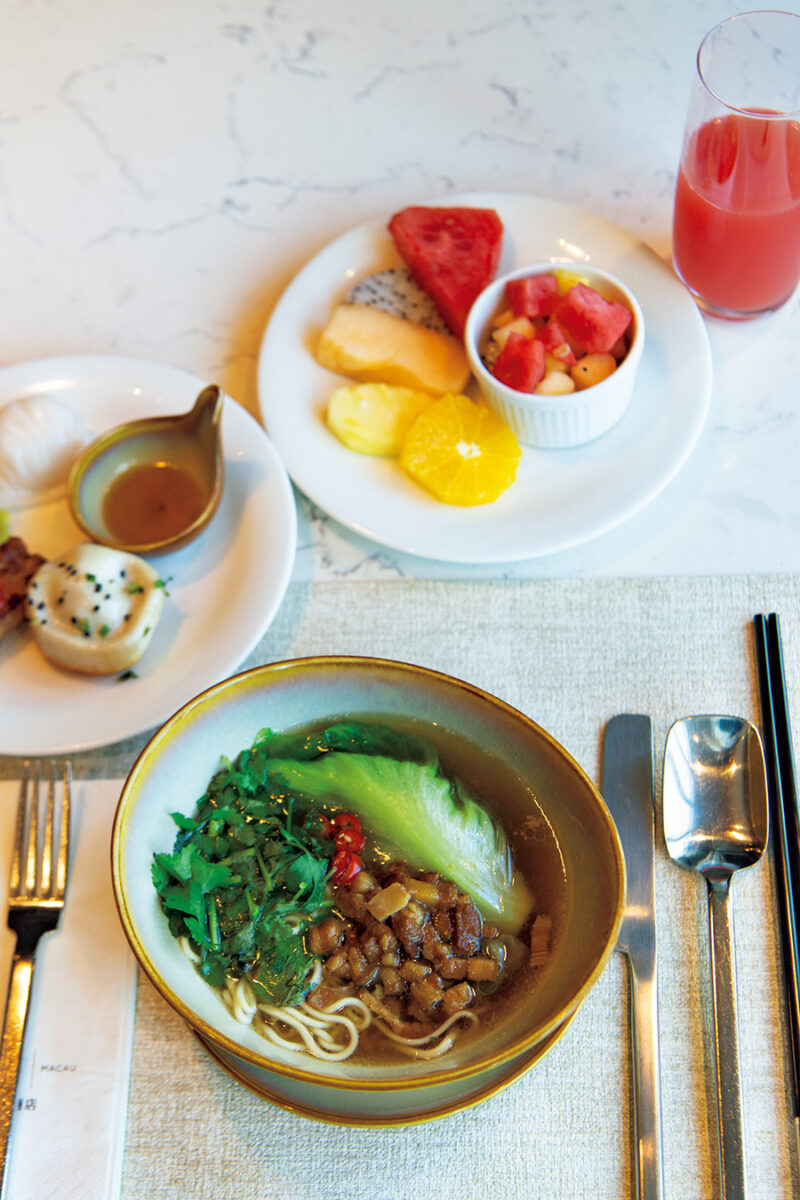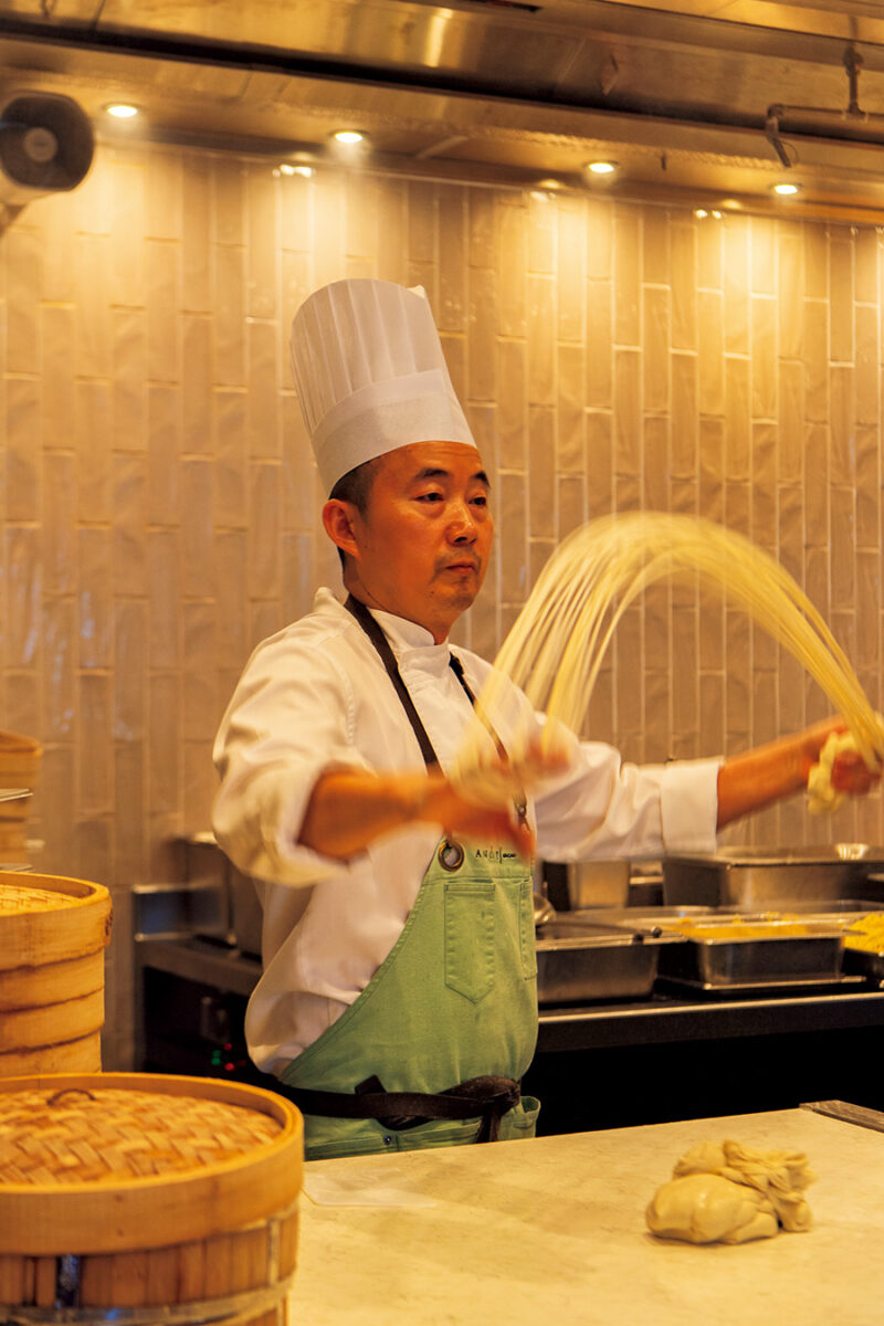 朝食ビュッフェでは、目の前で手打ちする麺や点心など、できたての料理も味わえる。