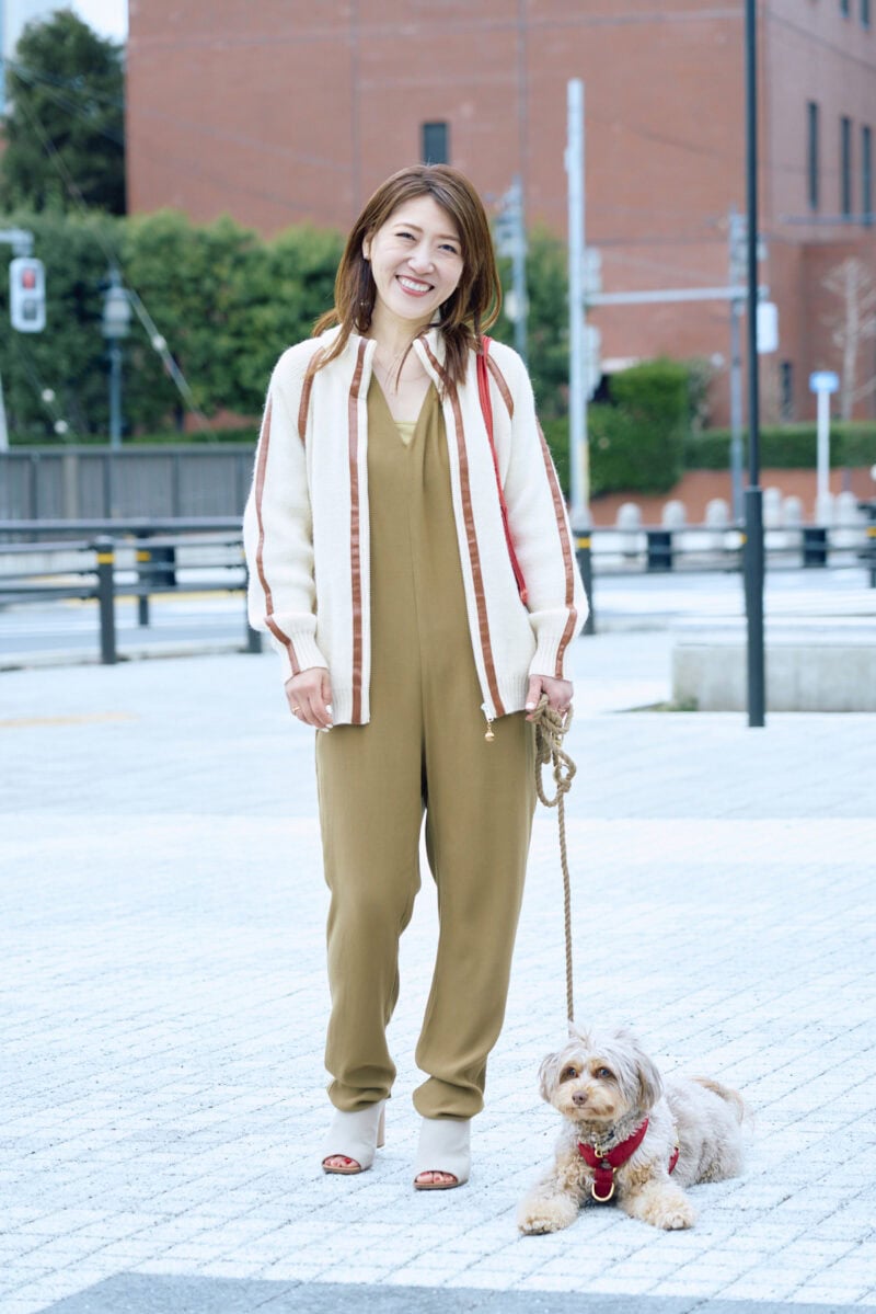 東京と軽井沢(長野県)の二拠点で暮らす栗谷さん。予定のない週末は愛犬のBeau(ボー)ちゃんを助手席に乗せて軽井沢へ。「一日中着ていられるストレスフリーな服を選びました」と栗谷さん。カシミアコートが主役のフェミニンなパンツスタイルに、サボやキャップでマニッシュをひとさじ。このミックス感はお手本にしたい。