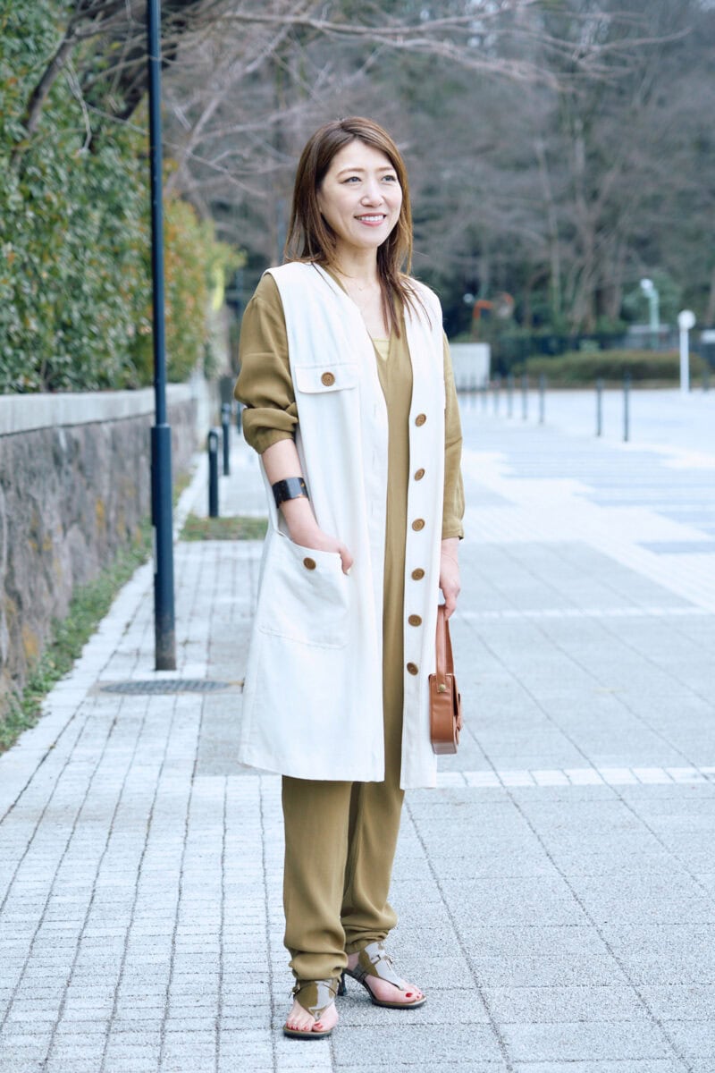 オールインワンに白いジレをはおると、きれいめにチェンジ。「お気に入りのシルクリネンののイヴ・サンローランのジレ。本来はワンピースですが、ジレにして出番を増やしてレイヤードを楽しんでいます」と栗谷さん。木製のボタンを目立たせるためにアクセサリーは控えめに。