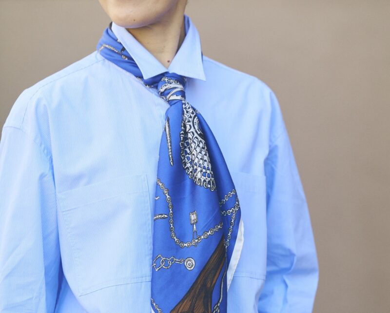 「コンパクトにしたい時のおすすめが、ネクタイのようにまとめる方法です。先にスカーフで輪を作ってそこに通せば、結び目が大きくなりすぎませんよ」。こちらも縦長なラインができるのでシャープな印象に。シャツの上に巻けばちょっとマニッシュに、小さめのスカーフならキュートにと、アレンジ自在です。