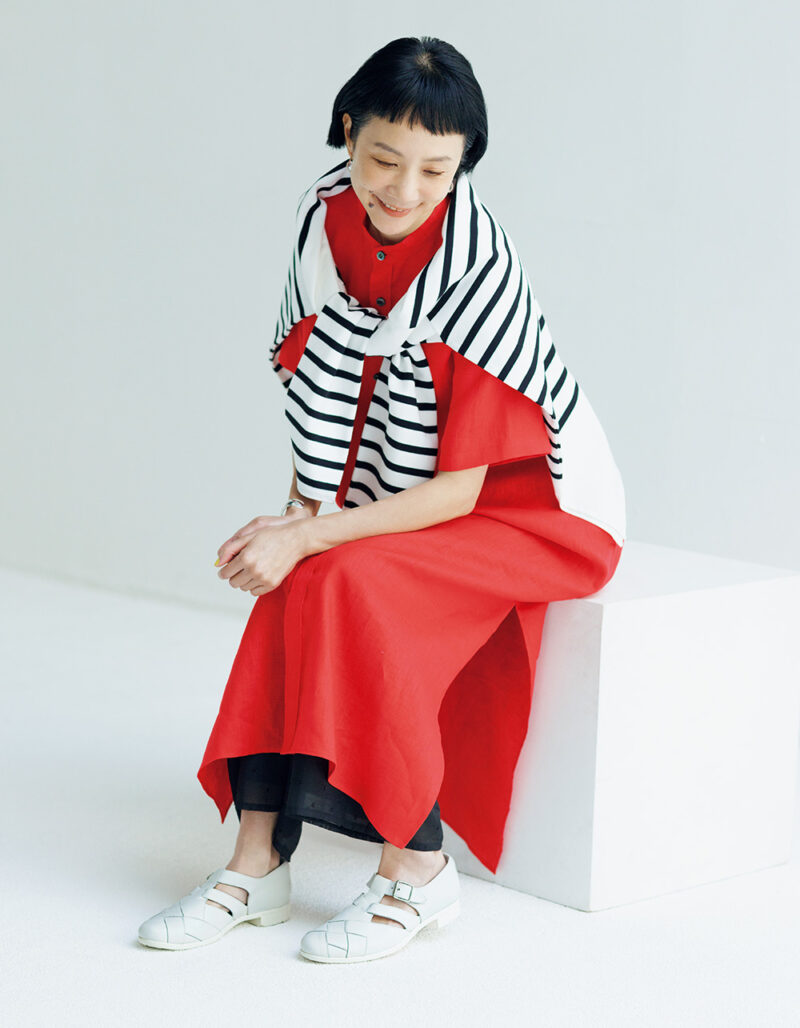 サンダル¥25,300 /トラベル シューズ(プリュスバイ ショセ)、ワンピース¥41,800、ボーダーニット¥38,500 /ともにハイク(ボウルズ)、パンツ¥31,900 /ティッカ、バングル¥35,200/ジャミレイ(プレインピープル青山)、ピアス¥38,500/テッド・ミューリング(カ ジツ)