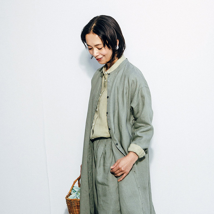 少しトーンの明るいグリーンのリネンシャツを中に合わせ、オールリネンのエレガントな着こなしに。