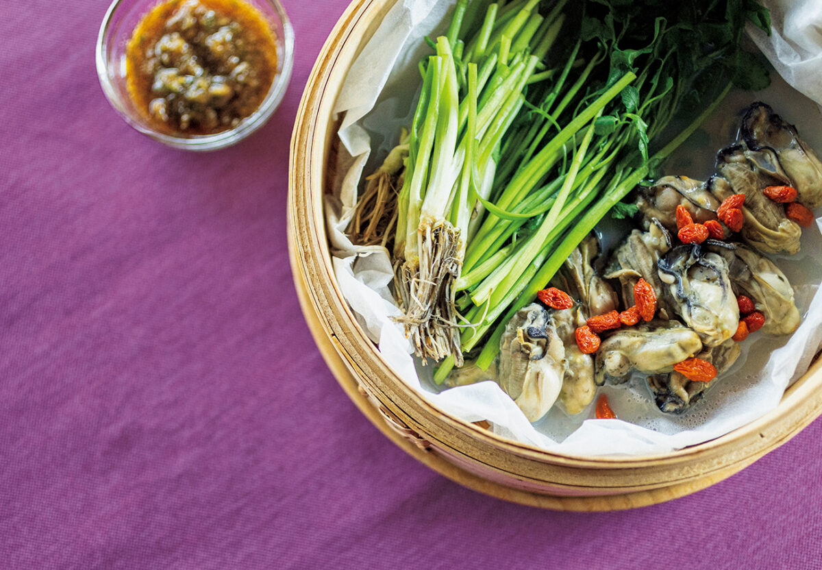 2. クッキングシートを敷いたせいろにかきを入れ、蒸気の上がった鍋にのせて中火で5 分蒸す。せり、クコを入れてさらに1分蒸す。
