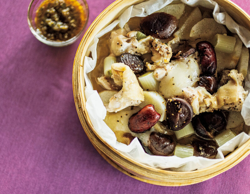 3. 蒸気の上がった鍋にのせて中火で10 分蒸し、粗びきこしょうをかける。そのままでも、万能たれをかけていただいてもおいしい。