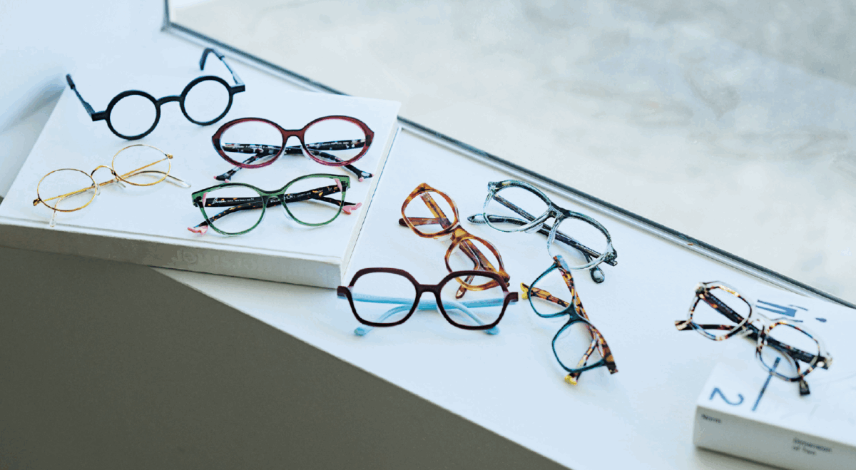 カラフルなセルのメガネはフランスのブランド「Face à Face(ファース ア ファース)」、左端のメタルフレームは、初めて作っためがねでヴィンテージ。