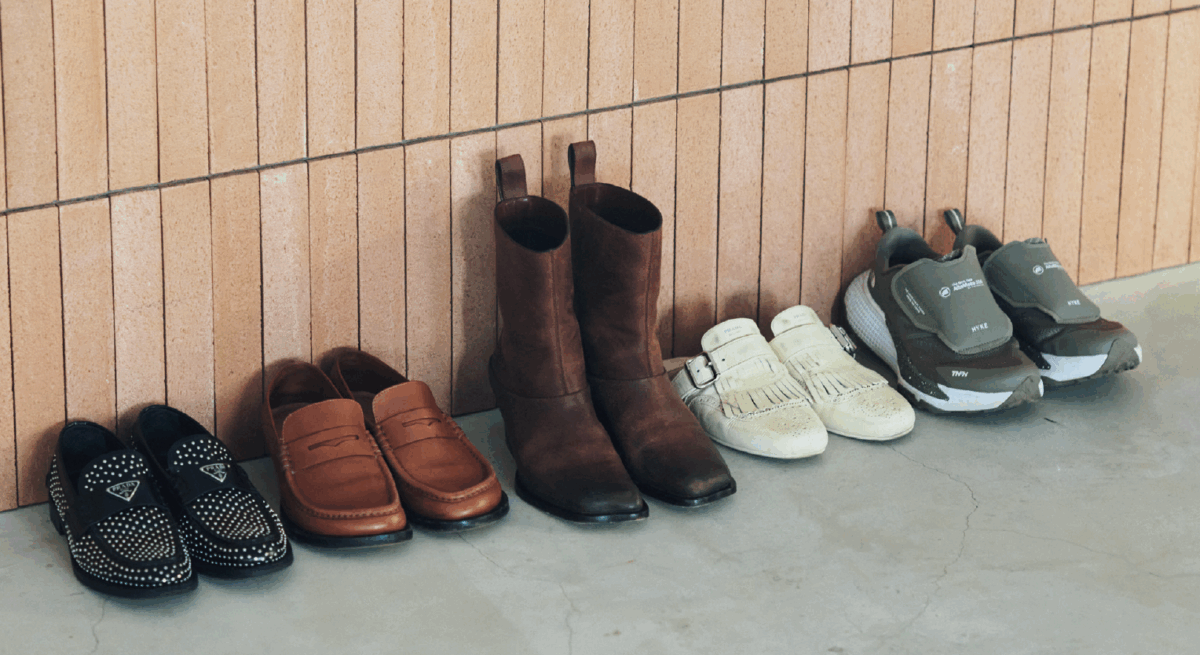 茶のローファーとブーツはロエベ、スニーカーはハイク×ノースフェイス。